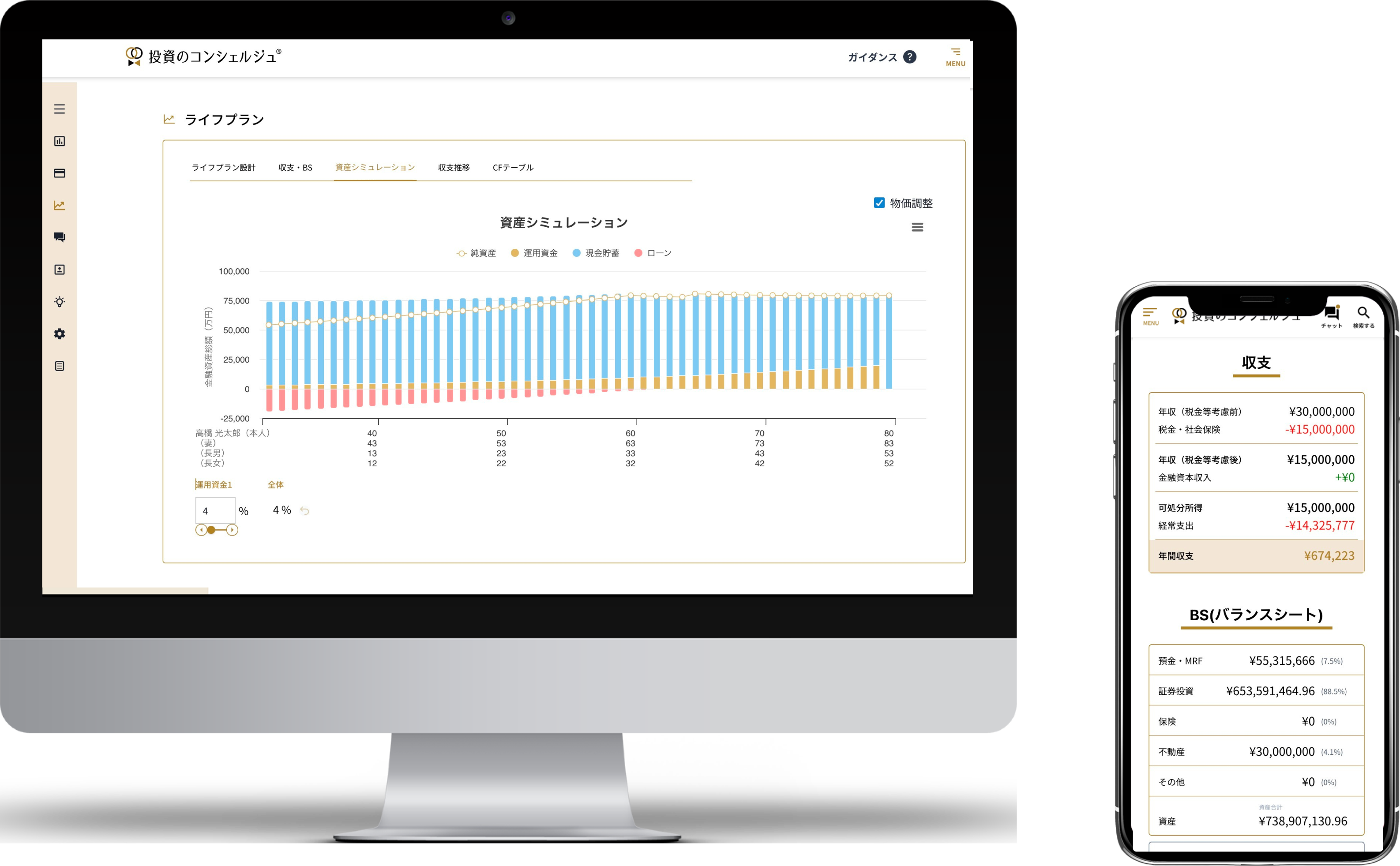 ライフプラン機能を活用することで、運用効果やインフレ率も加味しながら将来の資産状況を可視化できます。担当アドバイザーとのコミュニケーションもツールで完結。ニーズに合致したアドバイザーを探すこともできます。